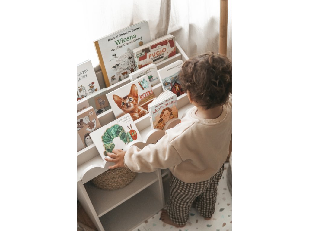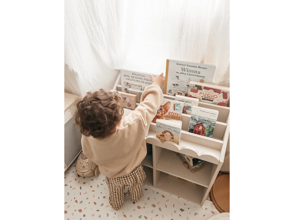 - Usporiadanie kníh inšpirované filozofiou Montessori (obálky kníh smerujú dopredu)