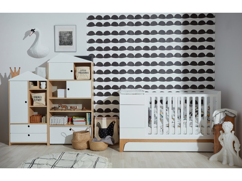 - poličky, čelo a čelá skriniek na hračky sú vyrobené z MDF lakované bielou farbou bezpečnou pre deti, certifikované podľa normy EN71 / 3