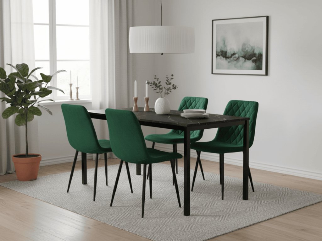 Jedálenský set 1 + 4, čierny stôl RAMOD 100x60 cm mramorový dekor + zelená stolička TURIN s čiernymi nohami