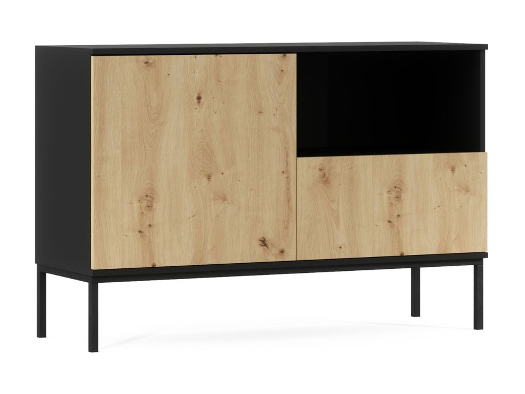 Vneste do svojho domova štýl i funkčnosť vďaka premyslenému úložnému riešeniu, ktoré spája estetiku a praktickosť. Komoda sa skvele hodí ako elegantný doplnok do obývacej izby, pracovne alebo predsiene, a jej kombinácia skriniek a otvoreného priestoru umožňuje ľubovoľné usporiadanie dekorácií, kníh alebo každodenných potrieb. Vďaka čistému dizajnu v čiernom prevedení vyniknú aj minimalistické dekorácie, sviečky alebo rastliny, ktoré dodajú interiéru osobitý charakter. Využite každé miesto naplno a vytvorte si prostredie, ktoré odráža váš štýl i potreby.