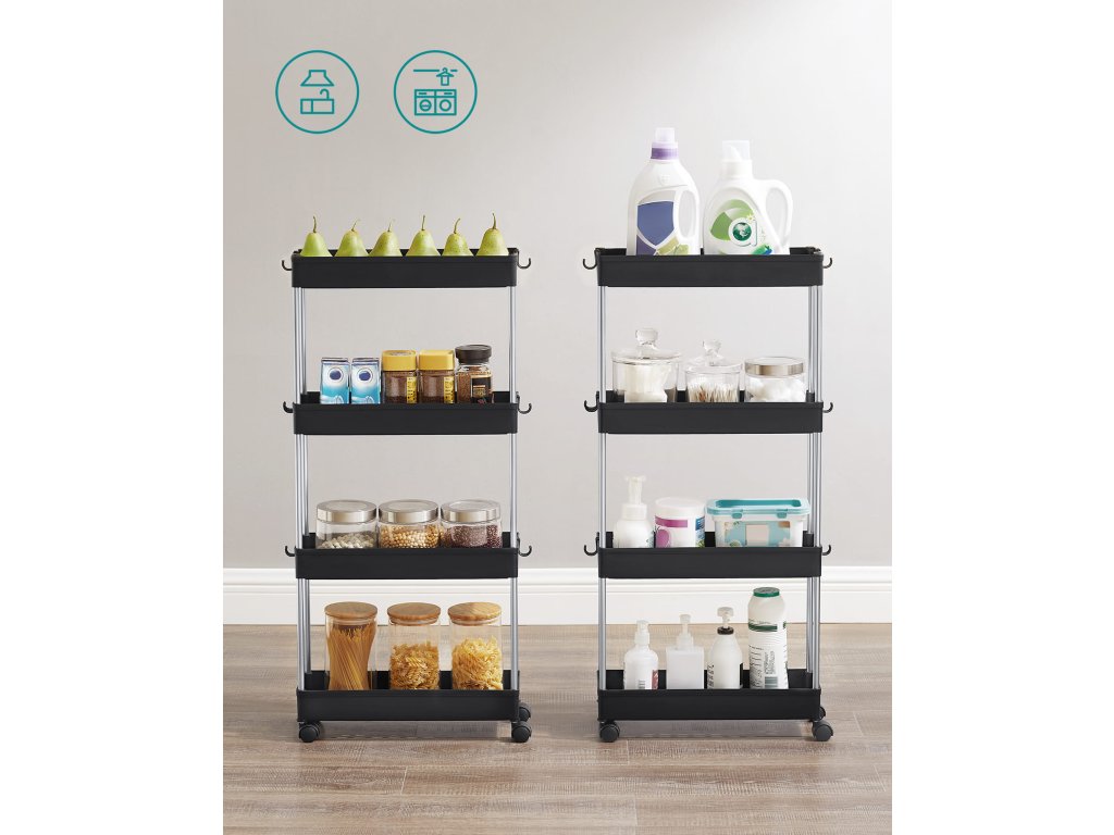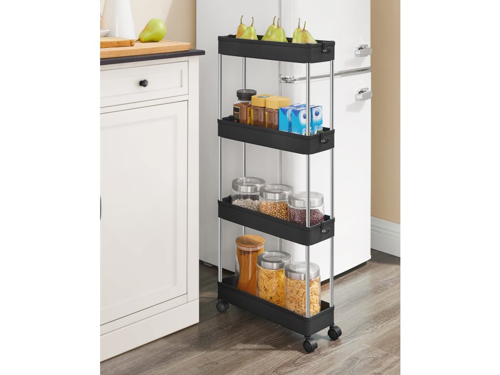 Úzky regál na kolieskach MOBIX so 4 košíkmi, čierny