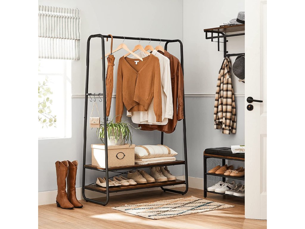 Tento multifunkčný stojan na oblečenie je ideálnym riešením pre tých, ktorí hľadajú efektívny spôsob, ako usporiadať svoj šatník. Vďaka dvom praktickým policiam a tyči na ramienka ponúka dostatok priestoru na odkladanie oblečenia, doplnkov alebo topánok. Skvele poslúži v spálni, šatni či predsieni. Elegantný dizajn navyše zapadne do industriálneho a rustikálneho interiéru a pomôže udržať všetko na svojom mieste. Urobte si vo svojom priestore poriadok a užívajte si pohodlie každý deň.