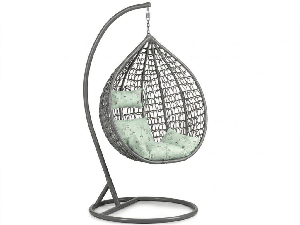 Sivé závesné kreslo KOKON so stojanom, svetlozelený vankúš so vzorom